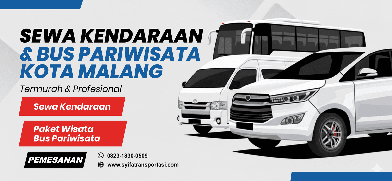 SYIFA TRANSPORTASI adalah salah satu perusahaan yang bergerak di bidang jasa Persewaan Kendaraan dan Paket Tour Wisata, yang di dirikan di Kota Malang, Jawa Timur. Kami juga menyediakan transportasi sesuai dengan kebutuhan customer.
